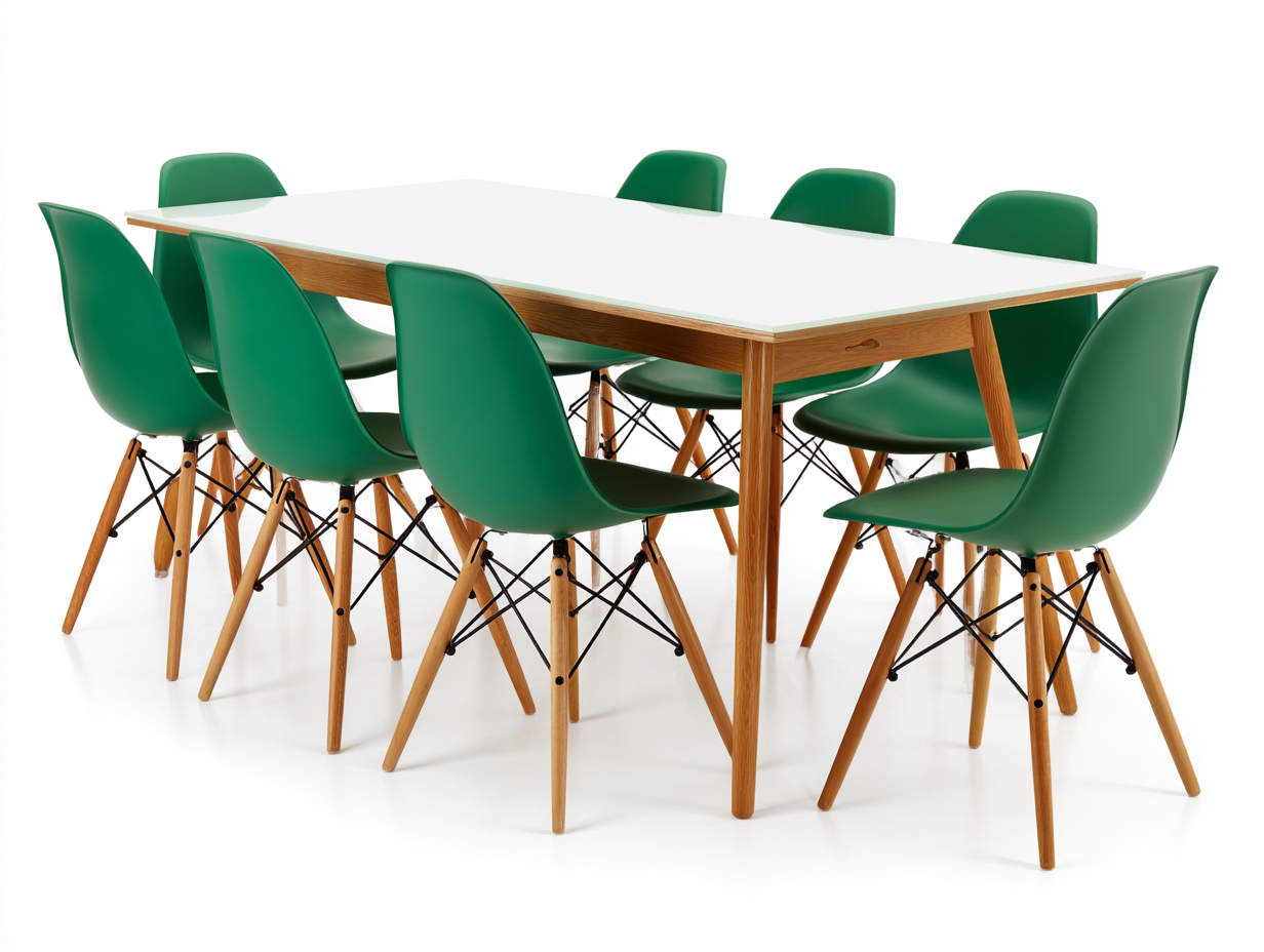 Le plateau de la table est fabriqué en panneau robuste avec finition lisse de couleur blanche, offrant une surface résistante et facile à entretenir. Les pieds de la table sont conçus en bois pour assurer solidité et stabilité. Les chaises sont dotées d'une coque en plastique moulé de couleur vert qui épouse la forme du dos pour un meilleur confort. Les pieds en bois renforcés par une structure métallique assurent une bonne stabilité et une utilisation durable.